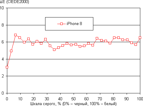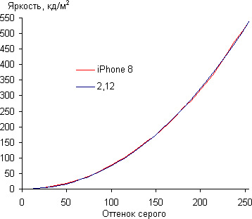 При ручном управлении яркостью и при выводе белого поля во весь экран максимальное значение яркости составило около 540 кд/м², минимальное — 2,5 кд/м². Максимальная яркость очень высокая, и, учитывая отличные антибликовые свойства, читаемость даже в солнечный день вне помещения будет на хорошем уровне. В полной темноте яркость можно понизить до комфортного значения. В наличии автоматическая регулировка яркости по датчику освещенности (он находится над прорезью фронтального громкоговорителя). Отметим, что исключительно для удобство пользователя, отключение и включение этой функции запрятано глубоко в настройки смартфона. Видимо, тем самым в Apple хотят по возможности держать автоматическую регулировку включенной, с целью продления времени автономной работы. В автоматическом режиме при изменении внешних условий освещенности яркость экрана как повышается, так и понижается. Работа этой функции зависит от положения ползунка регулировки яркости — им пользователь выставляет желаемый уровень яркости для текущих условий. Если ничего не менять, то в полной темноте яркость понижается до 3,2 кд/м² (очень темно), в условиях освещенного искусственным светом офиса (около 550 лк) яркость экрана устанавливается на 100-125 кд/м² (приемлемо), в очень ярком окружении (соответствует освещению ясным днем вне помещения, но без прямого солнечного света — 20000 лк или немного больше) поднимается до 610 кд/м² (даже выше, чем при ручной регулировке). Результат нас не совсем устроил, поэтому в темноте мы чуть подвинули ползунок яркости вправо, и для трех указанных выше условий получили 12, 105 и 610 кд/м² (идеально). Получается, что функция автоподстройки яркости работает адекватно, и есть возможность отрегулировать характер изменения яркости под требования пользователя. На любом уровне яркости значимая модуляция подсветки отсутствует, поэтому нет и никакого мерцания экрана.