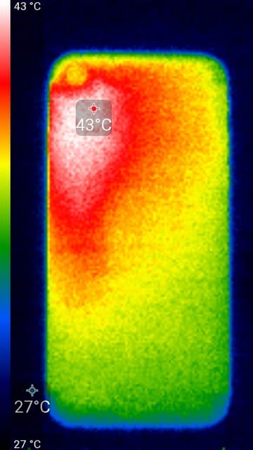 Нагрев сильно локализован в верхней правой части аппарата, что, видимо, соответствует расположению микросхемы SoC. По данным теплокамеры, максимальный нагрев составил 43 градуса (при температуре окружающего воздуха в 24 градуса). У Apple iPhone 7 нагрев в этом тесте примерно такой же.
