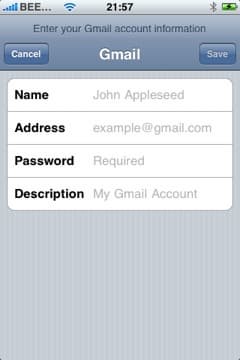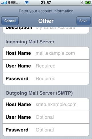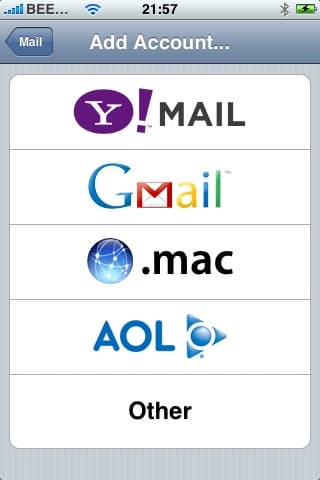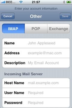 Почтовый клиент в iPhone позволяет работать с POP3, IMAP, а также Exchange-серверами. Вы можете настроить синхронизацию таким образом, чтобы все ваши e-mail эккаунты автоматически установились на iPhone. Можно это сделать и вручную — iPhone при запуске Mail предлагает установить учетную запись Yahoo! Mail, Gmail, .mac или AOL, в этом случае вам нужно будет лишь ввести имя, e-mail адрес, пароль и описание. Если вы хотите установить другую учетную запись, например, сервера Mail.ru, тогда вам нужно будет сделать это вручную.