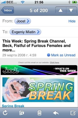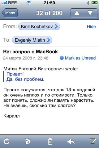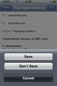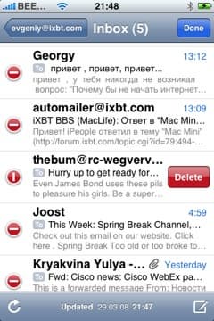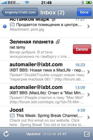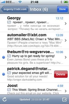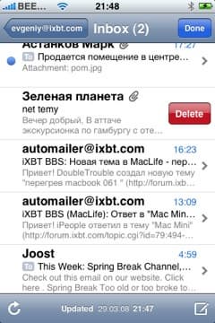 Удалять письма вы можете, находясь в общем списке. Либо нажмите Edit, потом появившийся красный минус слева от письма, а потом подтвердите кнопкой delete справа от него, либо просто проведите по заголовку письма слева-направо или справа-налево, после чего появится кнопка delete в правой части заголовка и нажав на нее, письмо удалится. Не совсем понятно, зачем, если вы выбираете функцию Edit, у вас все-равно для каждого письма iPhone спрашивает подтверждения. Было бы логичнее, чтобы вы сначала отметили все письма, которые хотите удалить, а потом iPhone спросил бы один раз, уверены ли мы.