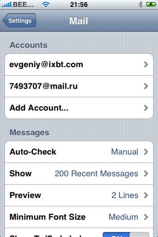 Теперь заглянем в настройки почты (Home Screen -> Settings -> Mail). Сначала об общих настройках, не привязанных к конкретному эккаунту. Auto-check позволяет выбрать интервал автоматической проверки писем (15, 30, 60 минут или вручную). Имейте ввиду, что проверка будет использовать GPRS/EDGE-трафик, если поблизости нет доступной Wi-Fi-точки доступа, а также будет сказываться на энергопотреблении, а следовательно, времени автономной работы iPhone. Таким образом, если вы не ждете очень важного письма, вы наверняка предпочтете ее отключить и проверять почту вручную — ведь каждый раз, когда вы заходите в почтовый клиент и выбираете эккаунт, если у вас их несколько, начинается проверка новых сообщений.