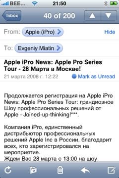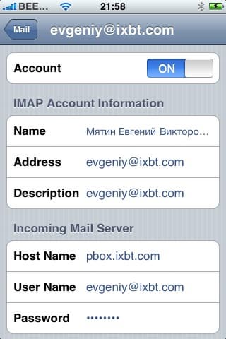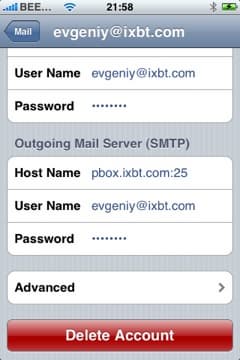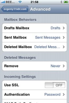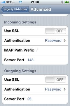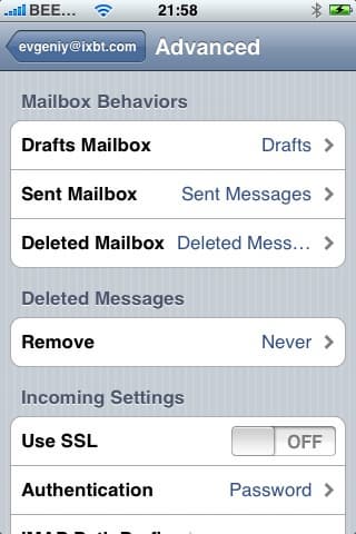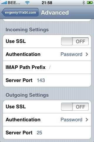 Во вкладке вы выбираете IMAP, POP или Exchange, заполняете необходимые поля, и готово. В теории. На практике, например, при установке того же Mail.ru, нужно будет сделать кое-что еще. Дело в том, что почтовый клиент, не спрашивая вас, устанавливает защищенное соединение SSL. Это хорошо, когда сервер поддерживает работу по SSL, а когда нет — тогда придется пойти на небольшую хитрость. Отключить SSL можно только тогда, когда эккаунт создан. Поэтому заполняем необходимые поля, ждем, пока iPhone попытается установить соединение. Если сервер не поддерживает SSL, то сделать это у него не получится, о чем он нам и признается — в диалоговом окне нужно отказаться от попыток продолжать установить соединение, но настройки эккаунта нужно все-равно сохранить. Теперь идем в Home Screen -> Settings -> Mail, выбирает эккаунт, нажимаем Advanced, и там уже отключаем SSL во входящих и исходящих настройках. Все, теперь все заработает.