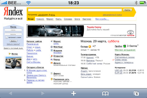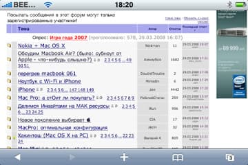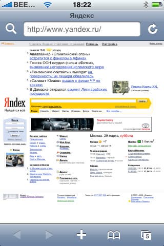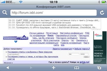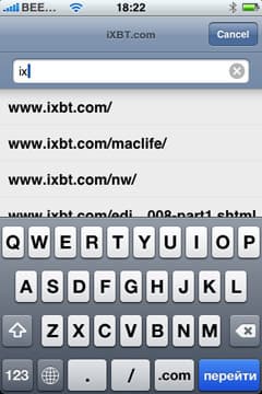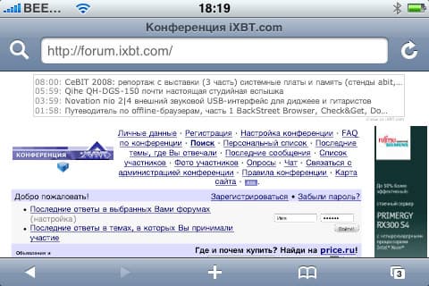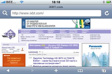 Скроллинг внутри страницы осуществляется традиционным для iPhone образом — просто «двигаем» страницу в нужную нам сторону. Адресная строка отображается только вверху страницы, при скроллинге вниз занимать ценное место она не будет. Сразу предлагаем совет: чтобы быстро добраться до самого верха страницы (а, соответственно, и до адресной строки), просто дважды нажмите на верхнюю часть браузера, там, где статусная строка.