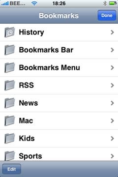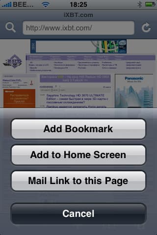 Нижняя панель, в отличие от верхней, присутствует постоянно — тут располагаются кнопки перехода «назад» и «вперед», плюс для дополнительных действий, кнопка вызова закладок, кнопка многооконного режима. С первыми двумя все понятно, плюс предлагает три действия — добавление страницы в закладки, добавление на Home screen, а также отправку ссылки по почте. Закладки представляют из себя полную копию закладок на «большом» Safari на Mac (если вы, конечно, включили опцию синхронизации закладок).