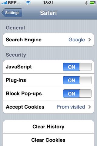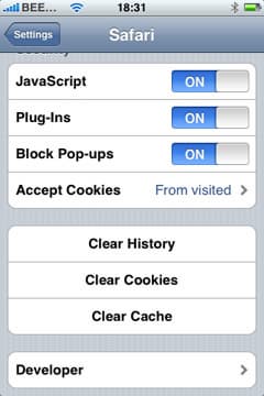 Что же, осталось заглянуть в настройки браузера. Здесь мы видим выбор поисковой системы (Google или Yahoo), возможности активации и деактивации JavaScript и плагинов, функцию включения блокировки pop-up окон, настройки Cookies (никогда, только от уже посещенных сайтов и всегда), кнопки для очистки истории, cookies и кэша, а также в меню Developer возможность активировать Debug Console, которая, в случае ее активации, автоматически будет появляться для решения ошибок, в случае возникновения таковых.