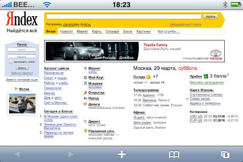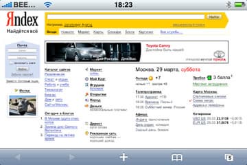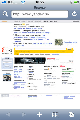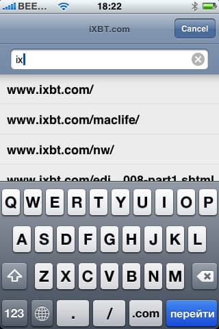 Браузер имеет две ориентации, в зависимости от положения самого устройства — горизонтальную и вертикальную. Верхняя панель состоит из адресной строки, значка поиска и значка обновления страницы. При нажатии на адресную строку, можем сразу начинать печатать адрес, не удаляя предыдущий — iPhone сделает это сам. Ниже появляется поисковая строка, мы можем использовать Google и Yahoo (по-умолчанию используется Google, изменение можно сделать в настройках). Для удобства набора окончание «.com» присутствует в виде одной кнопки. Ввводим адрес, загружается сайт.