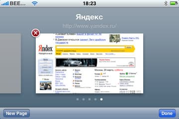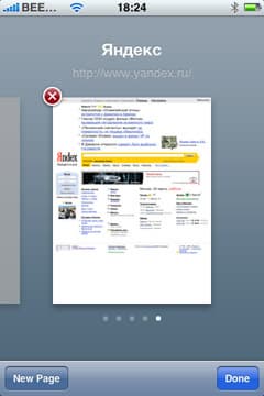 А вот многооконный (или многотабовый — как удобнее) режим — очень приятная возможность. При нажатии на эту кнопку, вы видите список открытых страниц с их превью, внизу есть кнопки «New Page» и «Done», на самих превью — крестик для закрытия страницы. Вы можете открыть одновременно до восьми разных страниц — согласитесь, очень внушительный показатель.