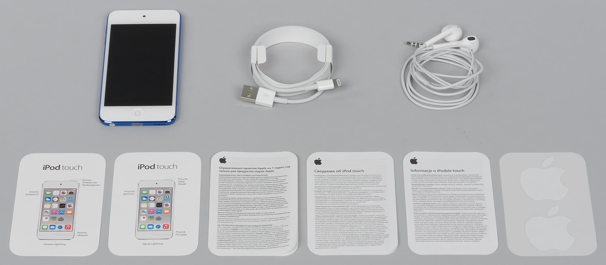 В целом никаких сюрпризов в отношении комплектации нет, все традиционно и аналогично iPod touch прошлого поколения и iPhone 6, за исключением отсутствия зарядного блока (он традиционно есть в iPhone, но отсутствует в iPod touch).