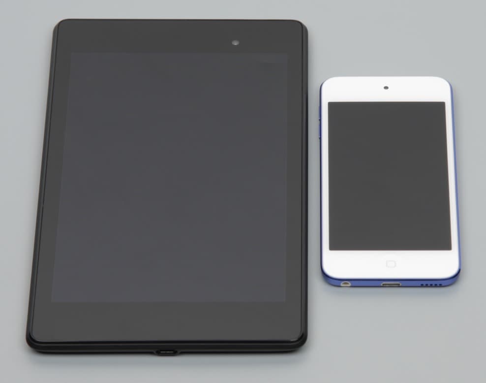 Лицевая поверхность экрана выполнена в виде стеклянной пластины с зеркально-гладкой поверхностью, устойчивой к появлению царапин. Судя по отражению объектов антибликовые свойства экрана лучше, чем у экрана Google Nexus 7 (2013) (далее просто Nexus 7). Для наглядности приведем фотографию, на которой в выключенных экранах отражается белая поверхность (слева — Nexus 7, справа — iPod touch, далее их можно различать по размеру):