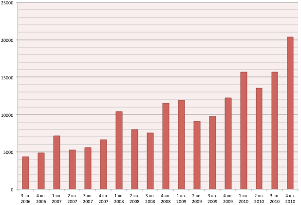 Меньший, чем ожидалось, уровень реализации iPad с лихвой перекрыли продажи iPhone: за минувший квартал было продано 14,1 млн. телефонов — на 91% больше, чем за аналогичный период прошлого года. Отметим, что предыдущий рекорд квартальных продаж iPhone был значительно ниже нынешнего показателя — он составлял 8,75 млн. (второй квартал 2010 финансового года). Доход от продаж iPhone принес Apple 8,82 млрд. долларов — на 92% больше, чем годом ранее. Средняя цена продажи телефона — 610 долларов.