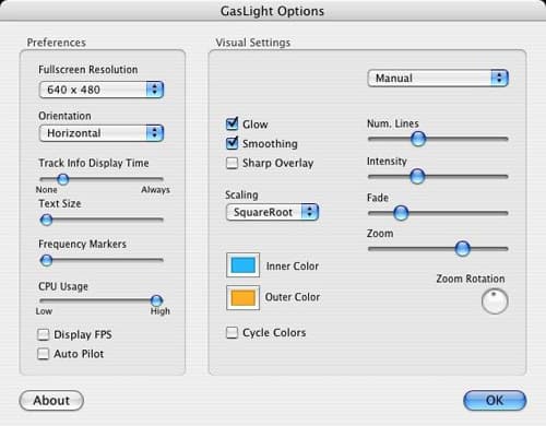 Для установки визуализатора, скачайте и распакуйте этот файл (для обладателей Mac OS X 10.3.8 и ниже — раннюю версию) и скопируйте файл GasLight.bundle в папку Library -> iTunes -> iTunes Plug-ins в вашей домашней директории. После этого перезагрузите iTunes и в меню Visualizer появится пункт GasLight. Выбрав его и включив сам визуализатор, в правом верхнем углу вы можете нажать Options и установить необходимые вам настройки.