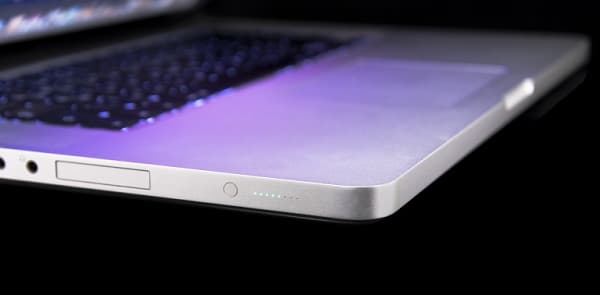 На левой стороне ноутбука мы видим порты и разъемы, слева направо располагаются MagSafe (питание), Ethernet, FireWire 800, 2 USB-порта, Mini DisplayPort, аудиовход, аудиовыход, ExpressCard/34, индикатор заряда аккумулятора (небольшая кнопка и 8 миниатюрных светодиодов).