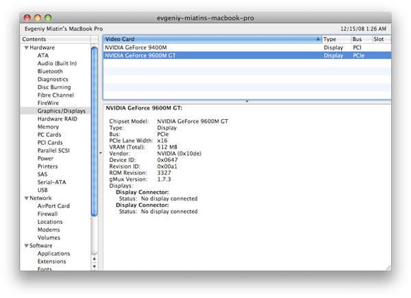 Отличительной особенностью MacBook Pro является наличие двух видеокарт — интегрированной NVIDIA GeForce 9400M (такая же установлена в MacBook и MacBook Air) и дискретной NVIDIA GeForce 9600M GT. К сожалению, хотя архитектура NVIDIA Hybrid SLI и позволяет переключаться между видеокартами «на лету» и даже использовать две видеокарты одновременно («Hybrid SLI GeForce Boost»), MacBook Pro делать этого не умеет.
