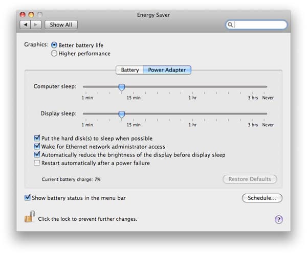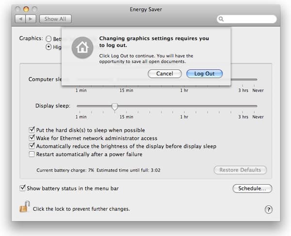Для переключения между видеокартами необходимо зайти в System Preferences -> Energy Saver и выбрать либо пункт «Better battery life», обеспечивающий работу на интегрированной NVIDIA GeForce 9400M при меньшей производительности, но большей экономичности использования аккумуляторной батареи, либо выбрать пункт «Higher performace», соответственно, для большей производительности и меньшей энергоэффективности. После чего компьютер предложит выйти из системы (log out) и зайти заново (ведь нужно перезапустить менеджер окон).