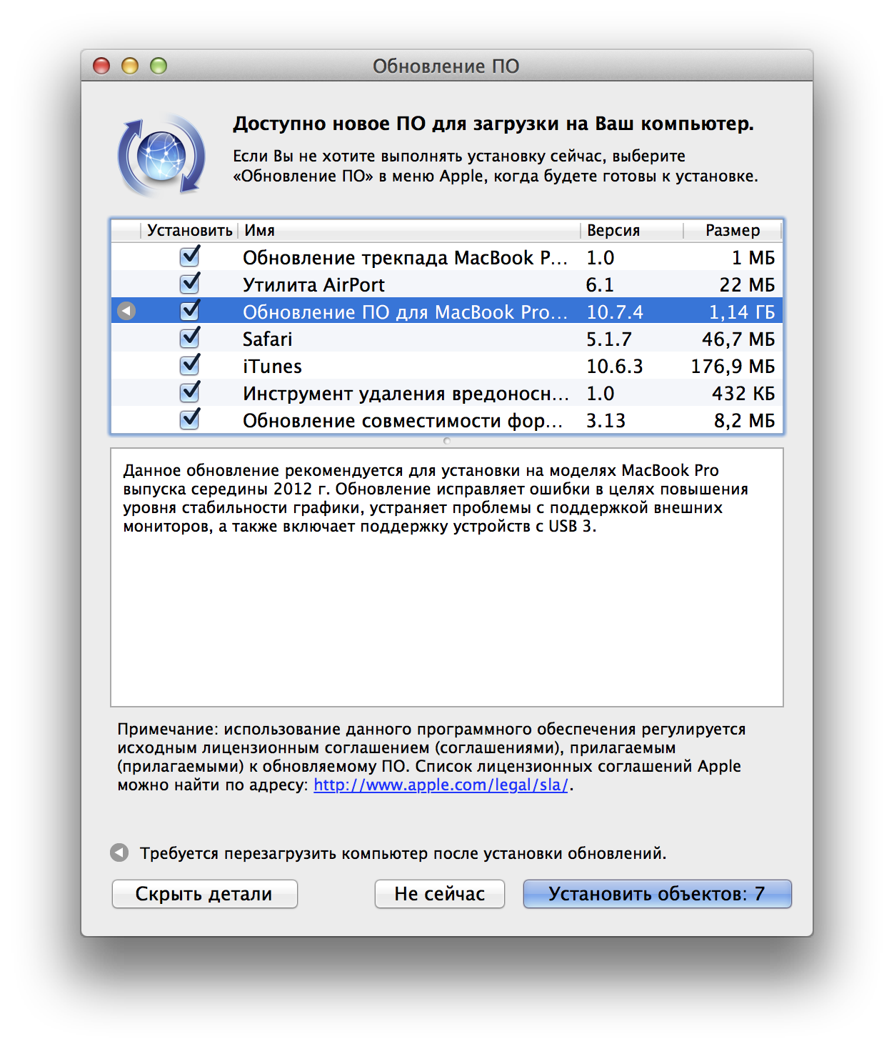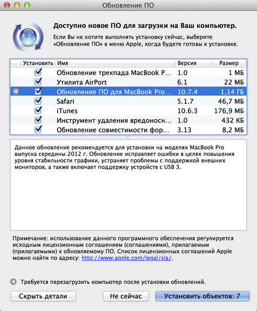 MacBook Pro Retina поставляется с предустановленной Mac OS X 10.7.4 Lion, но всем покупателям будет доступно (в июле) бесплатное обновление до Mac OS X 10.8 Mountain Lion. А пока нам предлагают семь обновлений, в том числе довольно крупное (1,14 ГБ) обновление, выпущенное специально для этой линейки MacBook Pro.