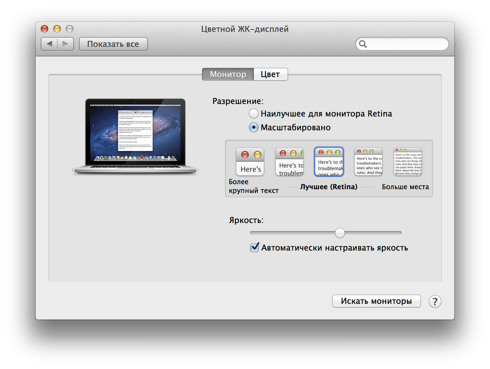 В принципе, описывать предустановленные приложения смысла нет, поскольку этот набор хорошо известен каждому пользователю компьютеров Apple и меняется с годами минимально. А о самой операционной системе у нас уже была статья, так что рекомендуем обратиться к ней. В данном же случае нас интересовало, в первую очередь, то, насколько хорошо ОС и ПО (как производства Apple, так и сторонних разработчиков) работают с разрешением Retina Display.