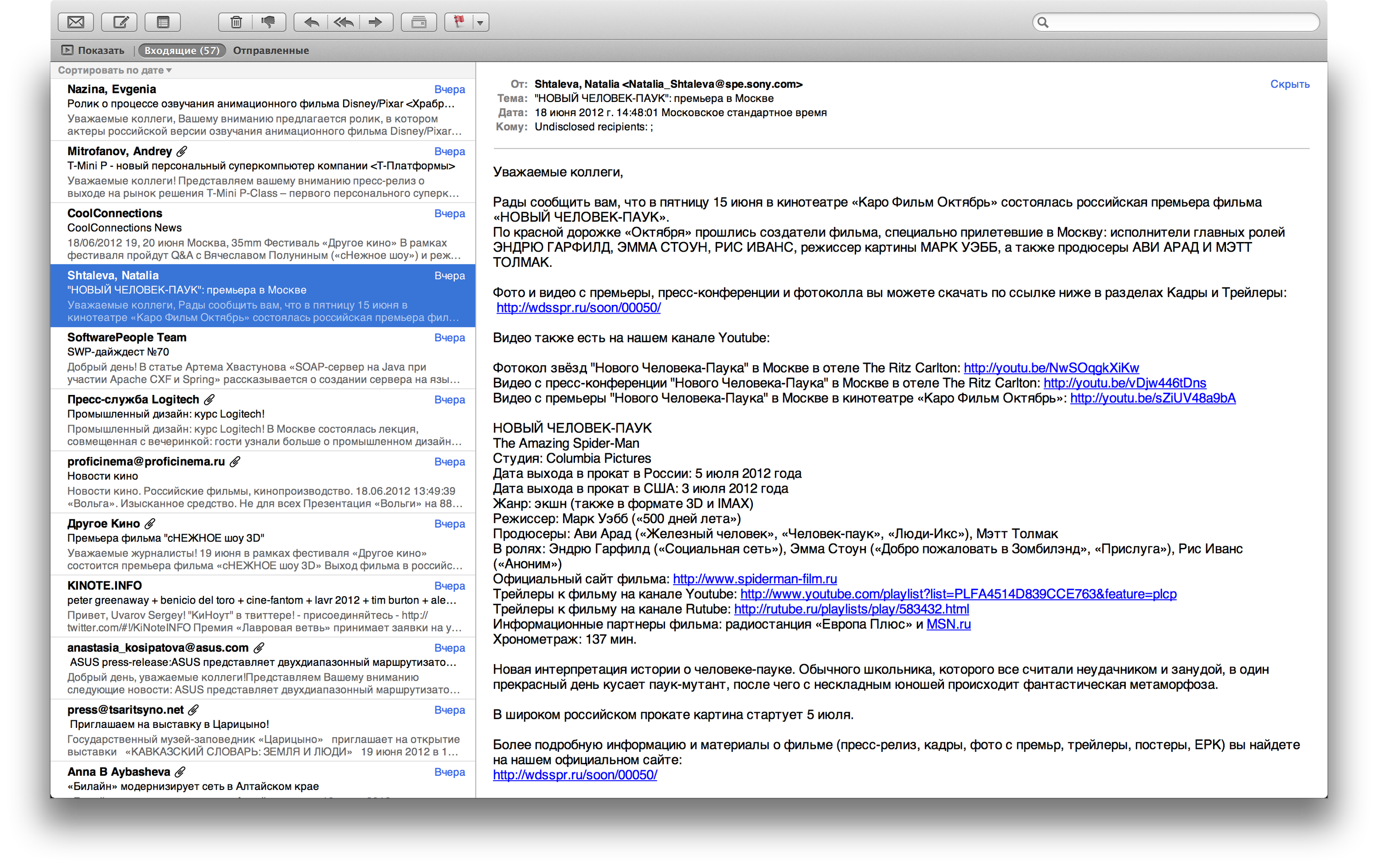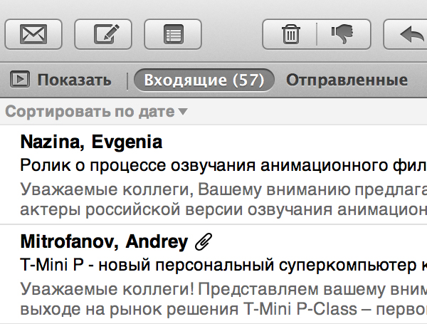Mail на MacBook Pro Retina выглядит замечательно. Все шрифты в письмах — гладкие, никаких проблем с текстовым содержимым нет, работать одно удовольствие. Правда, если в письмо вставлен графический элемент (логотип компании, например), то могут быть проблемы из-за нехватки разрешения этого элемента.