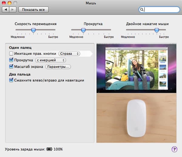 Если же ваш софт полностью соответствует требованиям Apple, то после установки Bluetooth-соединения между Маком и мышью зайдите в Системные настройки и кликните на Мышь. В открывшемся окне вы сможете настроить все функции Magic Mouse.
