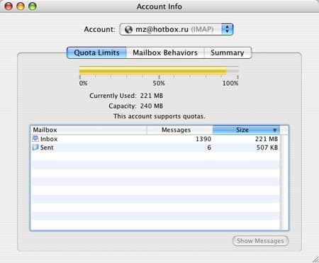 Почтовый клиент Mail, встроенный в Mac OS X Tiger, позволяет получать информацию у IMAP-сервера об объеме предоставляемого вам дискового пространства и о его заполненности. Это позволит своевременно увеличить ваш почтовый ящик, или удалить с сервера ненужные письма.