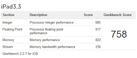 А вот результаты мультиплатформенного бенчмакра Geekbench, замеряющего производительность CPU и RAM, у нас не вызвали доверия. Набрав 758 баллов, The New iPad уступил не только Samsung Galaxy Tab 7.7, но и планшетам на NVIDIA Tegra 2, чего быть никак не может (так, у Sony Tablet S результат получился 888 баллов). Впрочем, iPhone 4S остался позади (613 баллов), так что если смотреть на результаты в рамках платформы iOS, то все логично.