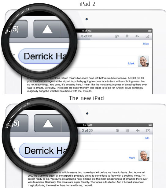 В первую очередь, речь идет о революционном разрешении (в рекламных материалах Apple использует слово resolutionary, объединяя слова «resolution» и «revolutionary». Действительно, 2048×1536 — невиданное прежде разрешение для планшетов. Даже самые амбициозные конкуренты анонсируют новинки с разрешением максимум до 1920 точек по длинной стороне. А Apple — не только анонсирует, но уже и выпускает: 16 марта новые iPad поступили в продажу.