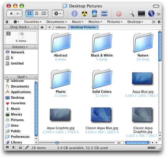 Третья, не настраиваемая панель, Drop Stack, имеет несколько применений. Пользователь может поместить в нее несколько файлов из разных папок, чтобы потом проделать с ними нужную операцию. При этом сами файлы остаются на своих местах, а в Drop Stack помещаются лишь ссылки на них. Когда все необходимые файлы выбраны, их можно скопировать или переместить в нужную папку, создать архив или записать на оптический диск. У этой, без сомнения, очень полезной панели присутствует один недостаток: она не отображает имена файлов, сообщая лишь об их количестве, что, вместе с отсутствием возможности изменения размера панели, делает невозможным просмотр и управление помещенными файлами.