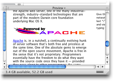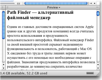 Preview. Панель Preview является, пожалуй, одним из самых интересных инструментов Path Finder. Она выполняет те же функции, что и одноименная утилита из состава Mac OS X, предоставляя при этом расширенные возможности. С помощью панели Preview, помимо файлов изображений и PDF, можно просматривать звуковые и видеофайлы, текстовые документы, HTML и файлы Microsoft Word, при этом имеется возможность копирования фрагментов текста в буфер обмена. Дополнительным удобством является то, что при выделении файла в окне браузера панель Preview отображает миниатюру автоматически, без необходимости открытия документа пользователем. Preview открывает все форматы файлов, совместимые с TextEdit и QuickTime. Стоит заметить, что разработчики предупреждают о некорректности работы панели Preview с некоторыми модулями QuickTime.
