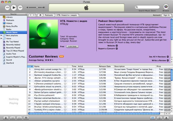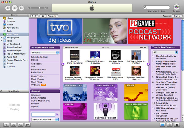Помимо простого и понятного интерфейса только через iTunes (как на платформе Mac, так и на PC), вы можете получить доступ к каталогу подкастов в iTunes Music Store, в котором на данный момент представлены более 3500 подкастов для свободного доступа (в отличие от музыкальных композиций, каждая из которых стоит 99 центов и приобрести которые можно лишь в ограниченном количестве стран). Основное большинство, конечно, на английском языке. Добавить подкаст, не представленный в каталоге, не составит никакого труда — достаточно просто перетащить нужную ссылку в программу.