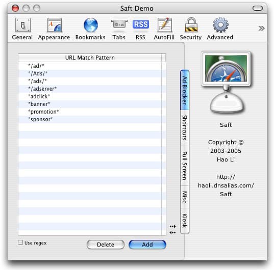 Для этого Saft использует простой фильтр по URL, который можно активировать через меню Safari —> Block Ad/Banners. Базовые настройки фильтра спасут пользователя от большого количества рекламы, а особенно придирчивые пользователи смогут установить параметры фильтра самостоятельно в соответствующем пункте «Ad Blocker» в меню настроек Misc. Традиционно, «звездочка» заменяет несколько символов, а знак вопроса — один, например, для блокировки всех ссылок, в любом месте содержащих текст «reklama» достаточно добавить строку «*reklama*», а для отклонения всех ссылок формата «ad#.somesite.com» — строку «ad?.somesite.com».