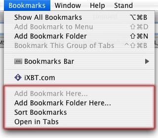 В каждой папке в меню закладок добавлены пункты «Add bookmark here…» и «Add bookmark folder here…». Как следует из названия, первый пункт позволяет добавить текущую веб-страницу в открытую папку, а второй — создать в ней подпапку. Функция пригодится тем, кто пользуется закладками из меню, на странице с полным списком закладок ее, разумеется, нет.