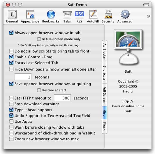 После установки плагина вы заметите новый пункт в панели Safari —> Preferences, где и производятся все необходимые настройки. Присутствует досадная недоработка в графическом интерфейсе — хотя на скриншоте разработчика все в порядке, на некоторых компьютерах значок Saft не помещается в верхнюю панель Preferences, что немного затрудняет к нему доступ. Чьей вины здесь больше — создателей браузера Safari, не добавивших возможность регулирования окна, или же разработчиков плагина, — непонятно.