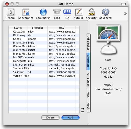 Как известно, по-умолчанию, справа от адресной строки в Safari расположена строка поиска. К сожалению, поддерживает оно только одну поисковую систему — Google. Saft же добавляет ей функциональности — помимо предустановленных сайтов для поиска (CocoaDev, Dictionary, Internet Movie Database, iTunes Music Store, MacOSXHints, Macupdate, Sherlock Dictionary, Slashdot, Versiontracker) пользователь может добавить свои собственные. Достаточно вызвать контекстное меню в любой форме поиска и нажать «Add as Saft Shortcut…». Правда, эта функция еще далека от совершенства — настроить корректную работу, скажем, с Яндексом, так и не удалось.