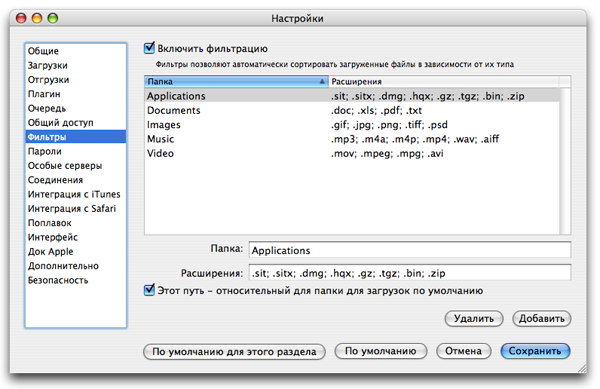 Еще одним способом упорядочивания загруженных файлов являются фильтры. Для того чтобы ими воспользоваться, нужно установить их параметры в соответствующем разделе окна «Настройки» (пункт Preferences меню Speed Download). Можно создать любое количество фильтров, определяя их с помощью типов файлов (расширений). Для каждого из фильтров в папке, в которую сохраняются загруженные файлы, создается отдельная папка.