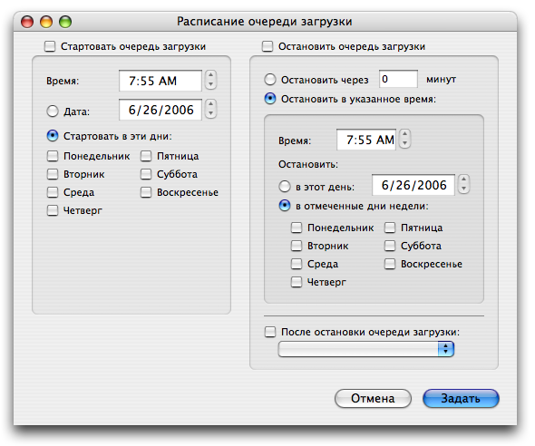 Процесс настройки расписания прост и очевиден: нужно выбрать дни недели и время старта и окончания загрузки. Альтернативой задания времени окончания загрузки служит указание отрезка времени, в течение которого (после старта) будет производиться закачка. В этом окне также можно выбрать действие, которое программа будет производить по окончании времени загрузки.