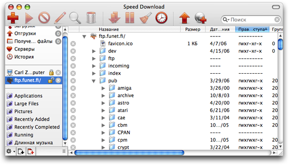 Запустив Speed Download, пользователь увидит типичное окно download-менеджера — панель инструментов, папки и список загрузок.