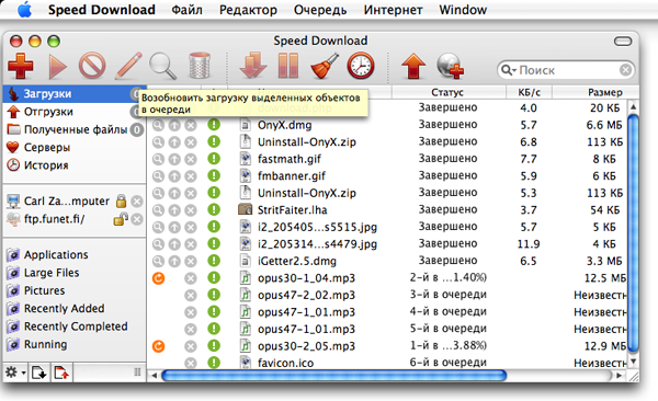 Трудно найти пользователя Интернета, который никогда не попадал в ситуацию, когда до окончания загрузки файла большого размера остаются считанные секунды (проценты, килобайты), и вдруг происходит обрыв связи. В таких случаях характер эмоций пользователя, а также их бурность определяется одним лишь фактором — какой программой выполнялась загрузка файла. Если это был web-браузер, то, за редким исключением, загрузку приходилось начинать сначала. Пользователям Mac OS X повезло больше — поставляемый вместе с операционной системой web-браузер Safari в некоторых случаях позволяет возобновить прерванную загрузку. Однако те, кто хоть раз воспользовался менеджером загрузок, вряд ли откажется от его использования в дальнейшем, ведь, помимо возобновления загрузки файла после обрыва соединения, представители этого класса приложений позволяют настроить множество дополнительных параметров загрузок.