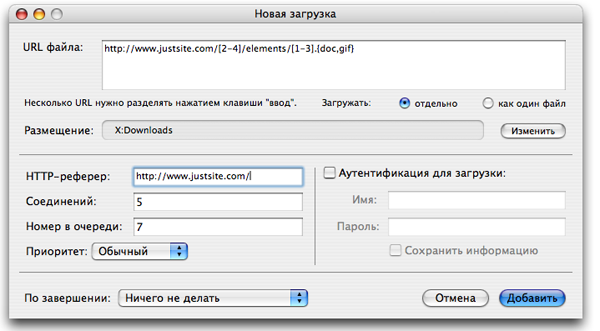 В открывшемся окне «Новая загрузка» необходимо внести все параметры новой загрузки. Поле «URL файла» позволяет ввести сразу несколько заданий, разделив их между собой символом возврата каретки (Return). Однако на этом возможности поля по помещению в очередь одновременно нескольких файлов не заканчиваются: для закачки нескольких файлов с похожими именами пользователь может ввести диапазоны изменяемых в их названиях символов c помощью квадратных и фигурных скобок. Рассмотрим эту возможность на примере введенного адреса http://www.justsite.com/[2-4]/elements/[1-3].{doc,gif}. Эта строка поставит в очередь следующие URL: