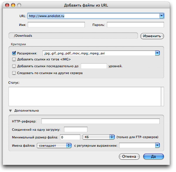 В окне настроек нужно указать адрес страницы, и, при необходимости, данные для аутентификации — имя и пароль. Здесь же можно выбрать параметры, по которым будут отбираться файлы для загрузки — указать расширения нужных файлов, задать количество вложенных страниц, с которых будут загружаться файлы, разрешить переходить по ссылкам на другие серверы. В настройках панели «Дополнительно» можно задать HTTP-реферера, количество одновременных соединений, минимальный размер файлов и фильтр для имен файлов.