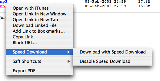 5. Непосредственно из web-браузера. Последний в нашем списке, этот способ является, пожалуй, наиболее распространенным. При установке Speed Download интегрируется в браузер Apple Safari. При этом в контекстном меню браузера, появляющемся при нажатии Control+Click на ссылку на файл, появляется новый раздел, в котором можно принудительно загрузить файл с помощью Speed Download, а также включить/выключить скачивание файлов с помощью менеджера по умолчанию.