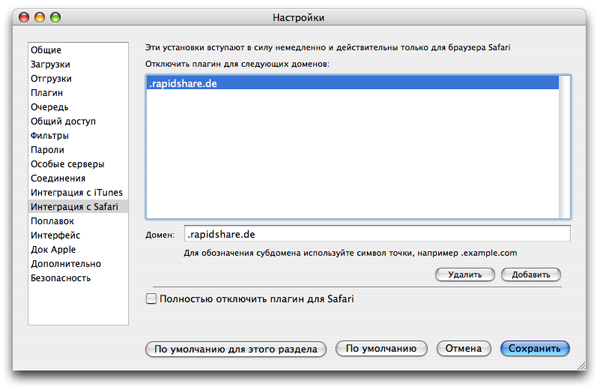 Интересной особенностью программы является возможность продолжения загрузки недокачанных с помощью Safari файлов. Для этого нужно перетащить мышкой частично загруженный файл на окно Speed Download, и его загрузка продолжится. В настройках программы можно указать, для каких страниц не следует применять Speed Download.