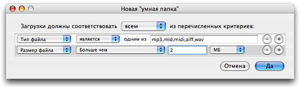 Начиная с четвертой версии, в Speed Download появилась возможность создавать «умные папки». Работают они по такому же принципу, как и плей-листы iTunes: открыв любую из них, можно увидеть все файлы, которые соответствуют заданным критериям, причем, в случае соответствия файла условиям нескольких папок, он будет доступен в каждой из них. Чтобы разобраться с принципом их работы, попробуем создать папку, в которую будут помещаться музыкальные файлы размером более 2 МБ. Для этого выберем из меню «Файл» пункт «Новая «умная папка». В качестве первого критерия выберем в полях открывшегося окна «Тип файла», «Является» и введем в оставшееся поле расширения музыкальных файлов — «mp3, mid, midi, aiff, wav». Вторым критерием, выбрать который можно, нажав кнопку «+», будет размер файла: выбираем «Размер файла», «Больше чем», «2», «МБ».