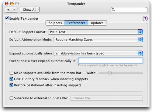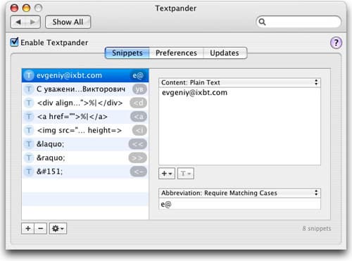Из плюсов, кроме удобного интерфейса и максимальной незаметности в работе (программа даже не располагается в Dock, не говоря уже о том, что вы вряд ли когда-нибудь столкнетесь с каким-то сообщением от нее), стоит отметить массу дополнительных функций TextPander: начиная от возможности вставки вместо обычных фрагментов текста изображений, текущей даты и времени, заканчивая настройками положения курсора и подключения специального файла с коллекцией сокращений.