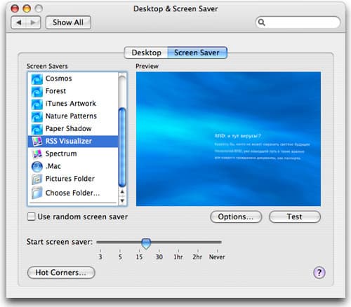 Как правило, скринсейвер несет в себе минимум смысловой нагрузки и чаще призван расслабить или порадовать пользователя, бросившего свой взгляд на монитор. Apple решила объединить развлекательную и информационную возможности, добавив в Mac OS X 10.4 штатный RSS-скринсейвер.