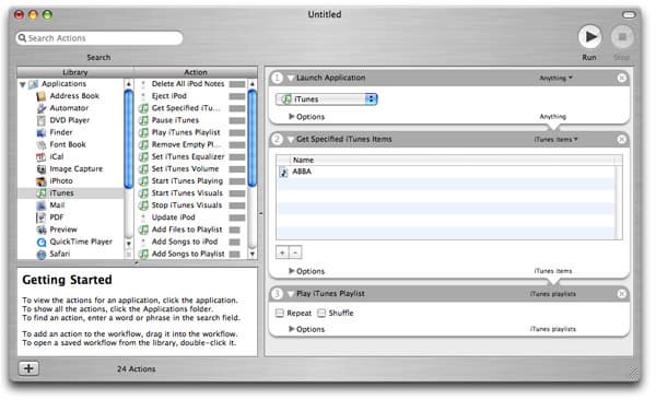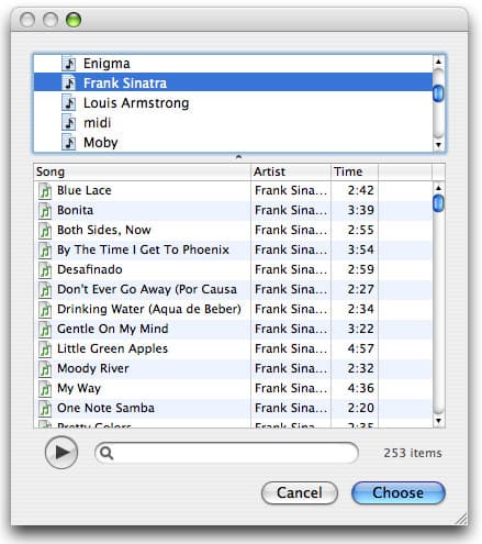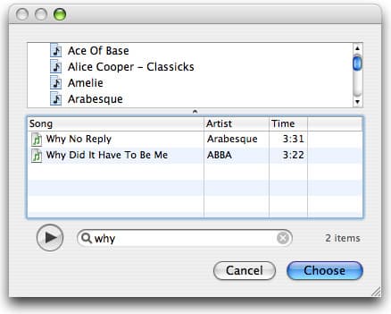 Таким же образом можно создать и мини-браузер библиотеки iTunes, и с его помощью выбирать нужные треки, имея даже возможность перед этим их прослушивать. Для этого в Automator нужно выбрать приложение iTunes и действие Ask for Songs.