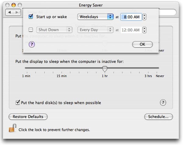 Осталось совсем немного — установить, когда компьютер будет включаться. Для этого в System Preferences > Energy Saver, нажав кнопку Schedule, выберем расписание включения и выключения компьютера по своему вкусу.