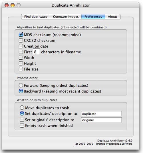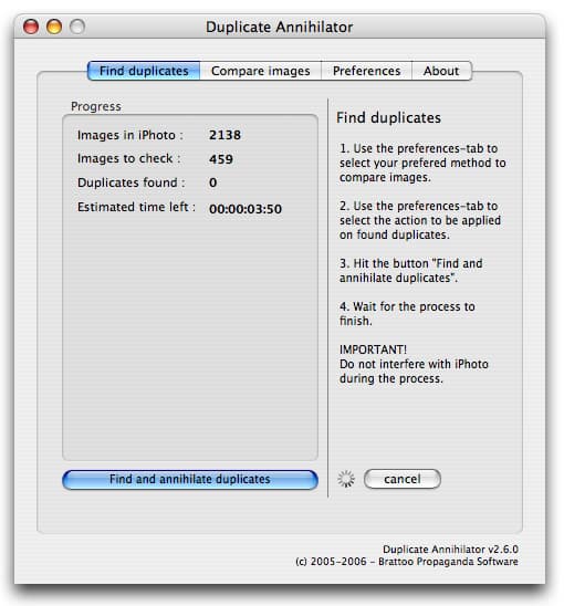 Последние версии iPhoto при импорте новых цифровых снимков с дисков, карт памяти и т. д., анализируют, нет ли среди уже имеющихся в библиотеке файлов полных аналогов новых помещаемых изображений. Однако, несмотря на это, некоторые пользователи все равно сталкиваются с проблемой наличия дубликатов — то есть, абсолютно идентичных файлов (двух и более), которые засоряют библиотеку, затрудняют управление файлами, забирают лишние системные ресурсы и нервы пользователя. Конечно, эта проблема вполне решаема, ведь можно, внимательно просмотрев библиотеку, удалить дубликаты вручную. Однако, тем кто пробовал это сделать с библиотекой, содержащей более двух тысяч фотографий, не позавидуешь. И тут на помощь может прийти удобная утилита компании Brattoo Propaganda Software — Duplicate Annihilator. Текущая версия, 2.6.0, работает с iPhoto 06 и способна сэкономить значительное количество времени пользователя.