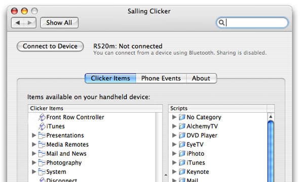 После установки Salling Clicker необходимо добавить этот скрипт, «научив», таким образом, программу работать совместно с Apple Front Row. Для этого нужно открыть панель Salling Clicker в System Preferences и добавить в окно Clicker Items нужный скрипт (Front Row Controller.cgz), просто перетащив его мышкой.