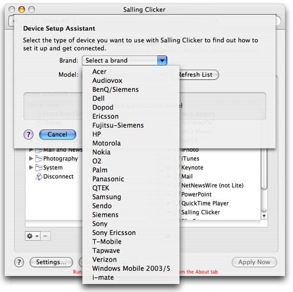После этого, нажав кнопку Set up Device, нужно выбрать модель устройства, которое будет использоваться в качестве пульта ДУ. Salling Clicker поддерживает множество различных телефонов и наладонников, поэтому ваш телефон почти наверняка окажется в списке, ведь утилита работает даже с такими «Bluetooth-пионерами» как Ericsson R520m и T39m. (Телефон, разумеется, предварительно должен быть «спарен» с компьютером с помощью Bluetooth Setup Assistant).