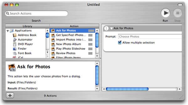 Запустить Automator. В левой панели из списка приложений выбрать iPhoto. Из списка действий (actions), предлагаемых для выполнения iPhoto, выбрать Ask for Photos и перетянуть его в правую панель.