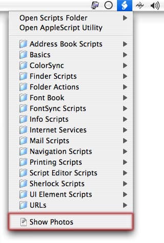 Теперь, раскрыв Script Menu и выбрав пункт Show Photos, мы моментально увидим на экране миниатюрный браузер библиотеки iPhoto. (Если Script Menu в строке меню не отображается, то его можно включить, запустив AppleScript Utility (/Applications/Applescript) и включив чекбокс Show Script Menu in menu bar).